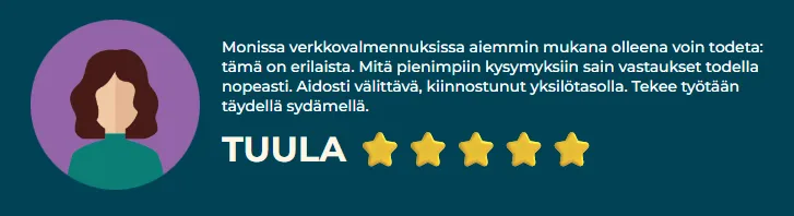 Monissa verkkovalmennuksissa aiemmin mukana olleena voin todeta: tämä on erilaista. Mitä pienimpiin kysymyksiin sain vastaukset todella nopeasti. Aidosti välittävä, kiinnostunut yksilötasolla. Tekee työtään täydellä sydämellä.